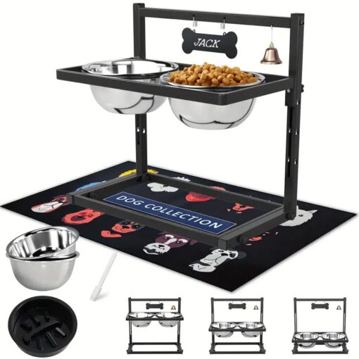 Make mealtime healthier and cleaner for your pet with these Elevated Dog Bowls featuring a heavy-duty iron stand and adjustable height design. Perfect for medium and large dogs, this dining station promotes better posture and digestion while minimizing spills and messes. The two removable stainless steel bowls are ideal for both food and water, while the slow feeder helps prevent gulping and bloating. Complete with a non-slip base and spillproof mat, it ensures stability and cleanliness on any floor surface.